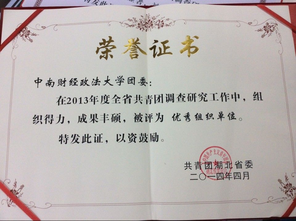 (通讯员:林晶晶)4月18日上午,在省委党校学术报告厅举行了2013年度湖北共青团调研工作表彰通报会暨第一期“青年理论骨干培训班”结业仪式。团省委书记张桂华、副书记邹霞、副书记张澍以及各级团组织的团干代表参加了活动。会上,我校团委被授予2013年度“全省共青团调查研究工作优秀组织单位”,同时由校团委青年研究中心完成的《文化地理视域下青年文化街区的构建----以昙华林为例》项目和与团省委统战部共同完成的《当代青年知识分子的思想倾向及引导对策研究》项目荣获“优秀调研成果三等奖”,校团委周巍同志荣获“调研工作先进个人”。