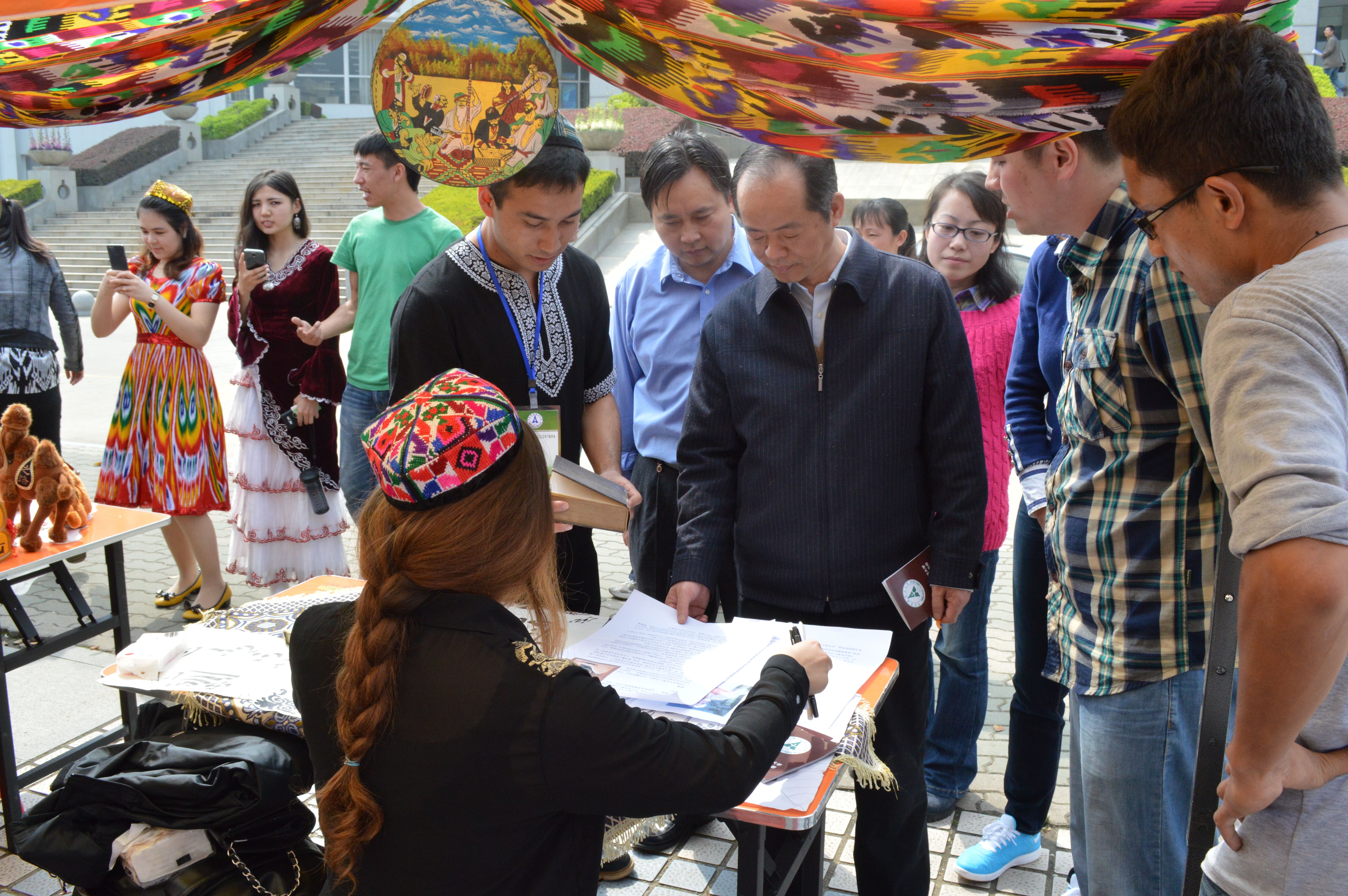 参观中,校党委书记张中华认真听、看和询问各民族所展示的动人神话传说、珍藏典籍、特色民族服饰、民族文字和绘画作品,品尝各民族特色传统美食。当他走到哈萨克族的展示区时,哈萨克族的一对姑娘、小伙儿正在现场模拟民族结婚嫁娶习俗,一对“新人”盛情邀请他做“主婚人”,亲身体验和感受民族婚嫁文化。