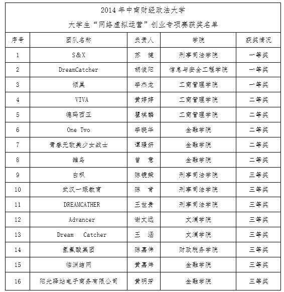 2014年米兰电竞·(中国区)大学生“网络虚拟运营”创业专项赛结果公示