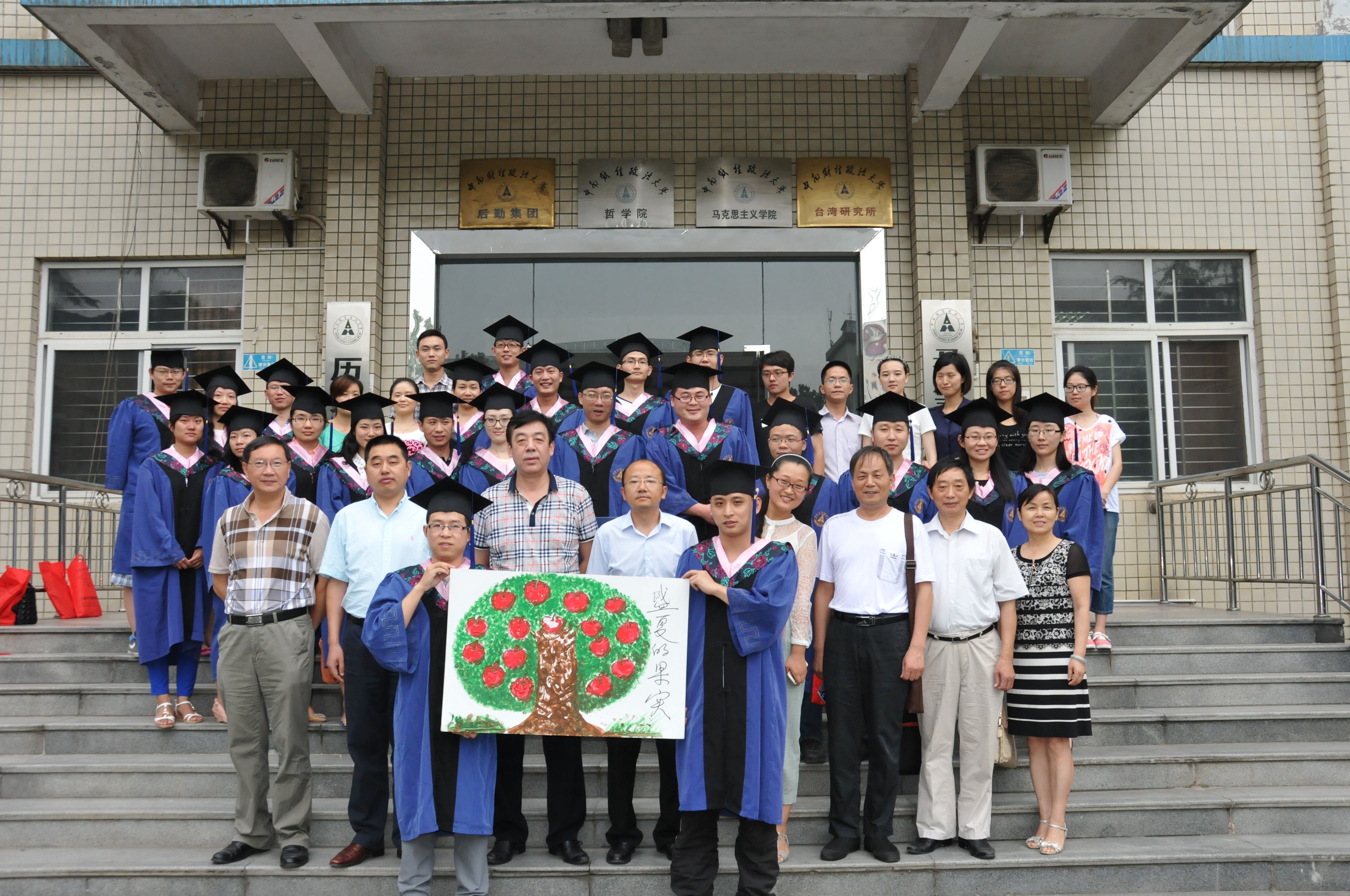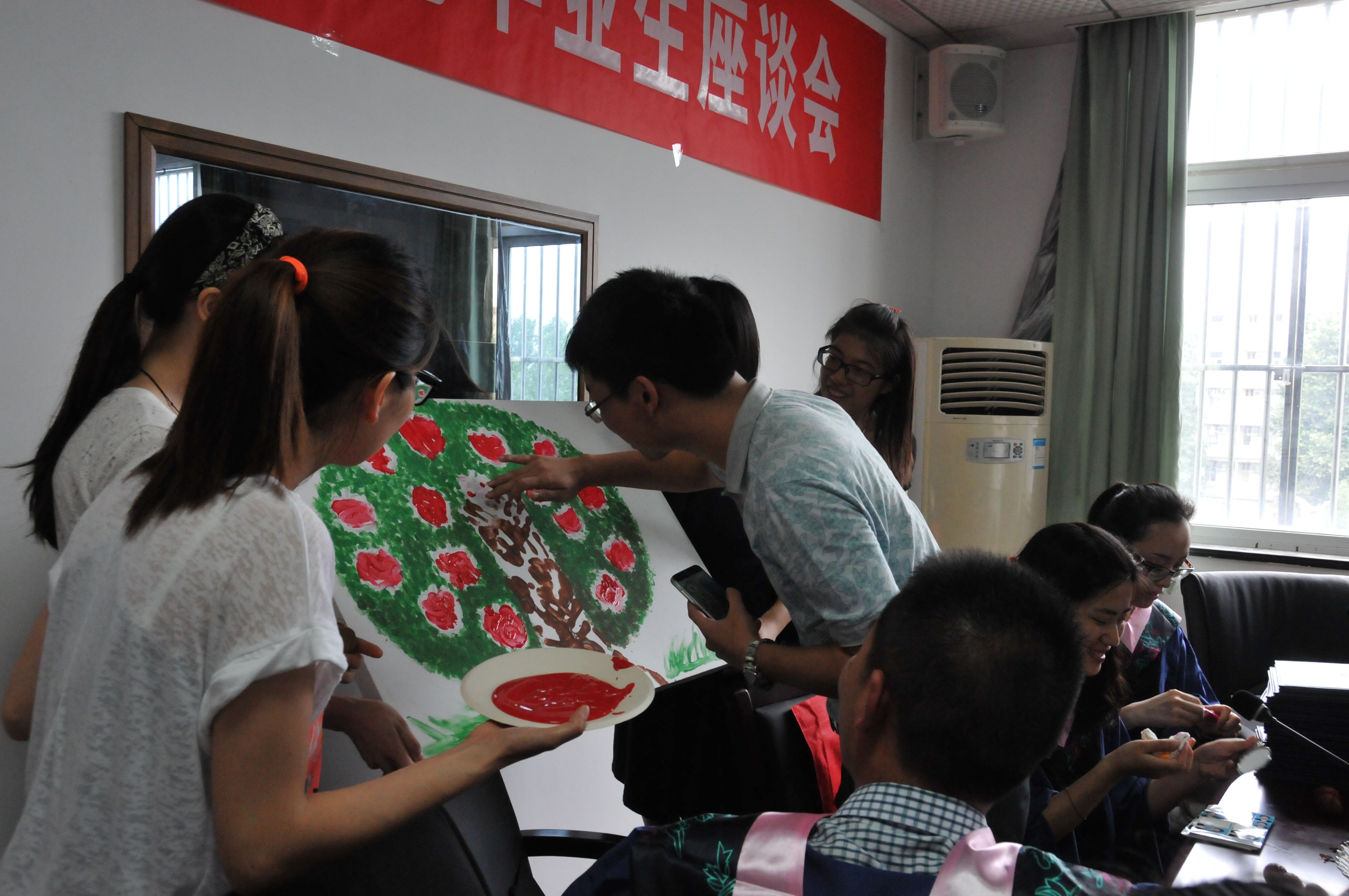 欢送会在轻松愉快的气氛中开始,首先播放了辅导员高老师带领部分13级的同学精心为即将毕业的师兄师姐们准备的视频,画面里的每一幕场景,都让师兄师姐们回忆起入学以来的点点滴滴,视频结尾高老师和13级同学跳起《小苹果》点燃了现场激情。 观看完视频后,师兄师姐们在感动和祝福中一起完成了苹果树手指画的制作,树干由学院老师绘制,代表老师们向学生不断输送养分,树叶由13级学生绘制,代表未来即将成长为果实的他们,苹果由14届毕业生现场绘制,代表在老师的培养下、同学的关怀下他们已经成长为一颗颗丰硕的果实,何院长为这副充满浓浓情意的画提了“盛夏的果实”五个字。随后,学院为毕业生送上写满祝福的苹果贺卡并颁发毕业证书。
