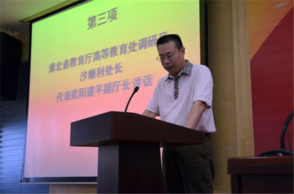 湖北省教育厅高教处沙顺利调研员代表欧阳建平副厅长发表讲话,表达湖北省教育厅与湖北省高等教育学会对学院十周年庆典的祝贺,希望学校与学院进一步融入全省新闻事业发展,推进产学研合作,支持地方经济建设,为湖北省新闻传播教育事业做出更大贡献。