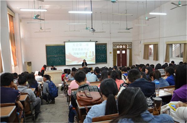 大会开始,黄艳通过四个关键词——责任、机会、负担、希望表达了自己对学生工作的思考与认识,她表示,这同时也是对新任学生干部的要求与期望。在观看了团学宣相关视频后,分团委副书记周敏怡发表讲话,指出同学们应“踏踏实实做好几件事”,不要三心二意。关于学生工作,她认为同学们应当常常问自己“if not me,who;if not now,when”,从而促进自我的提高与工作的发展。学生会主席康玉洁则幽默地讲述了一个陪伴其室友三年、简单却耐用的杯子的小故事,并通过这个杯子说明:应做一个实用的人,应学会坚持,同时要将责任感转化为主人翁意识。“请你坚持,当你坚持不下去的时候,还是想说,请你坚持。”康玉洁这样说到。