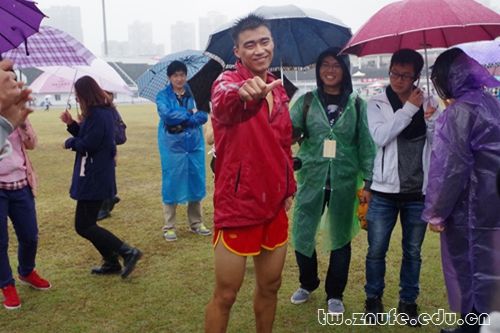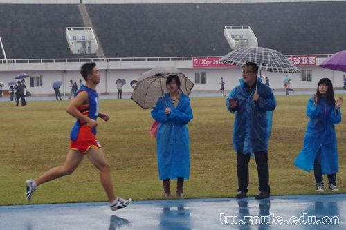 上午,在男子5000米决赛即将开赛之际,雨势突然转大,运动员们仍然激情不减,踏着雨水完成了12圈半的赛程。来自法1307班的刘赫一直遥遥领先,成功折桂。在跑完全程后,他举着院旗在赛道外奔跑,法学院所有师生为之欢腾。在随后的采访中,刘赫表示,5000米的赛程对他来说是一种享受,而凉爽的天气给了他充分发挥的条件,“长跑的奥秘就是把一个大目标分解成多个小目标,然后一一实现。”在另一组比赛中,吴能同学和钟明念同学也在最后的冲刺中分别取得第六、七名。