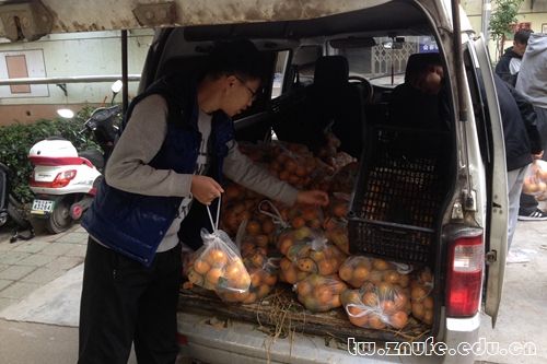 11日下午,送来的橘子由各班班干部分发到同学的手里。其中,法1304班一个寝室就购买了20斤,该寝室的何博同学说:“橘农也都不容易,虽然我们也不能真正解决他们的困境,但也算是我们的一点心意。”
