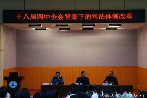 (通讯员 黎晓露)11月29日下午,四川大学法学院教授左卫民,中国刑事诉讼法学会副会长、中国社会科学院法学系教授王敏远应邀莅临我校法学院讲学,共话“十八届四中全会背景下的司法体制改革”。讲座在文潭楼一楼报告厅举行,副校长姚莉教授主持,诉讼法学科部分教师、研究生及法学院众多学子参加此次讲座。