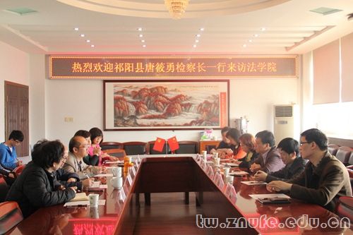 (通讯员 贺超 马昕 郭天宁)3月25日上午,湖南省永州市祁阳县唐筱勇检察长携院常务副检察长黄永明,党组成员王蔚,政工科钟腾飞,办公室于敏敏来访法学院。法学院院长徐涤宇教授,副院长麻昌华教授、黎江虹教授,党政办公室主任张今柯老师,培训部主任万怀民老师等参加座谈。双方在文治六楼会议室就合作事宜进行洽谈。