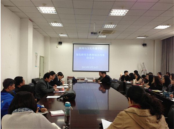 (文/李萌)3月26日下午,新闻与文化传播学院在文波楼五楼会议室召开深化研究生教育综合改革动员会,学习学校关于研究生教育综合改革的系列文件,深入认识研究生教育综合改革方案的具体内容,领会改革方案的基本精神。院长胡德才、党委书记赵楠、全体研究生导师和所有在校研究生参加了会议。