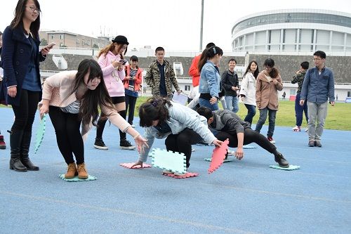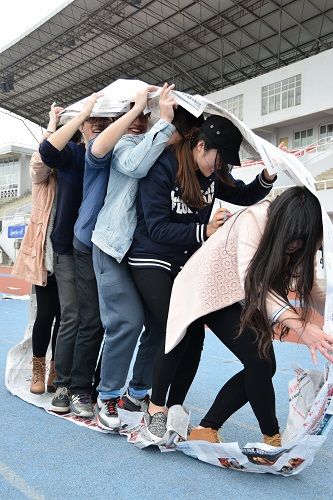 而在“头脑风暴”的环节中,大家则开始了团队间的智力大比拼,誓将一战进行到底。本环节的题目涉及理化、文史、经济、政治等多方面的知识,甚至还加入了脑筋急转弯,兼顾了教育性与趣味性。最后一个活动是“‘风火轮’传送”,此活动要求各团队都必须选出六名队员参赛,大家用报纸制作出一个“风火轮”,然后队员踩在报纸上前进。只有大家步调一致,齐心协力,才能顺利迅速走到终点。活动最后,三个项目得分进行累加,获分最高的团队获胜。
