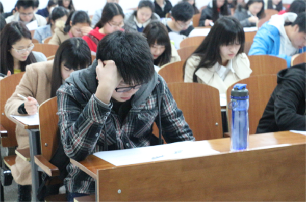 考试之前,已有学生早早来到考场,适应考试环境,为考试做好充分的准备。考试期间,考生有的埋头沉思,沉着严肃;有的胸有成竹,落笔迅速。考试紧张有序地进行。考试开始仅一个小时,已经有两名同学完成试卷,早早离场。期间有少数同学陆续离场。但大多数同学基本保持一致的答题速度,在考试接近尾声的时候,上交答卷。