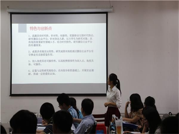 在主持人简短的开场白之后,答辩会正式开始。答辩人分别从立项背景、前期准备、调研方式、创新特色、预期成果等方面对自身项目进行阐述。十五个项目着眼点多种多样,充满了创造力与思考力。有热点现象的调研,有全新项目的创业;有当前形势全新条件下的发展路分析,有传统文化少数民族的生存经探讨;有立足本专业的现象透视,有跨越多学科的事物研究。针对高校新闻人才建设这一问题,也有大学生记者团校内外结合和高校内部改革发展这两种角度。