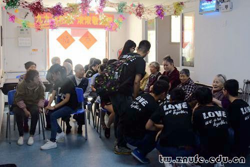 志愿者们为老人们准备了祝福明信片和精彩的节目。他们甜蜜舒缓的小合唱——《粉红色的回忆》使人感觉到了属于那个年代的优美旋律。合唱《打靶归来》和独唱《北京的金山上》更是使现场氛围迅速升温。老人们不约而同地为志愿者鼓掌打节奏。不少老人们也即兴上台,与志愿者们共同表演。一位老爷爷饱含深情地演唱了经典歌曲《红梅赞》。悠扬的歌声似带我们回到了那段革命的岁月。满头白发的唐奶奶唱起了《小燕子》,不是童声,却尽显童心。