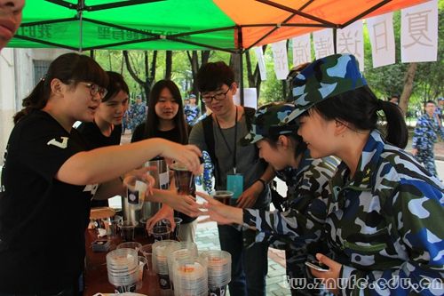 志愿者们为刚刚军训完毕的新生们准备了消暑佳品酸梅汤。军训很辛苦,当新生们拿到一杯杯凉凉的酸梅汤时绽放出了灿烂的笑容。同时,志愿者们为新生们介绍了一些军训期间预防中暑和跌伤的小知识以及中暑之后的应急措施。对于前来咨询学院信息和未来学习生活的新生,志愿者们根据自己的经验作了耐心的解答,并鼓励大一新生们要积极热情地迎接大学四年生活。此外,志愿者们拿着消暑饮品深入到学生宿舍、教学楼等一些地方,为一些往来路人、清洁工人送去清凉和真切问候。