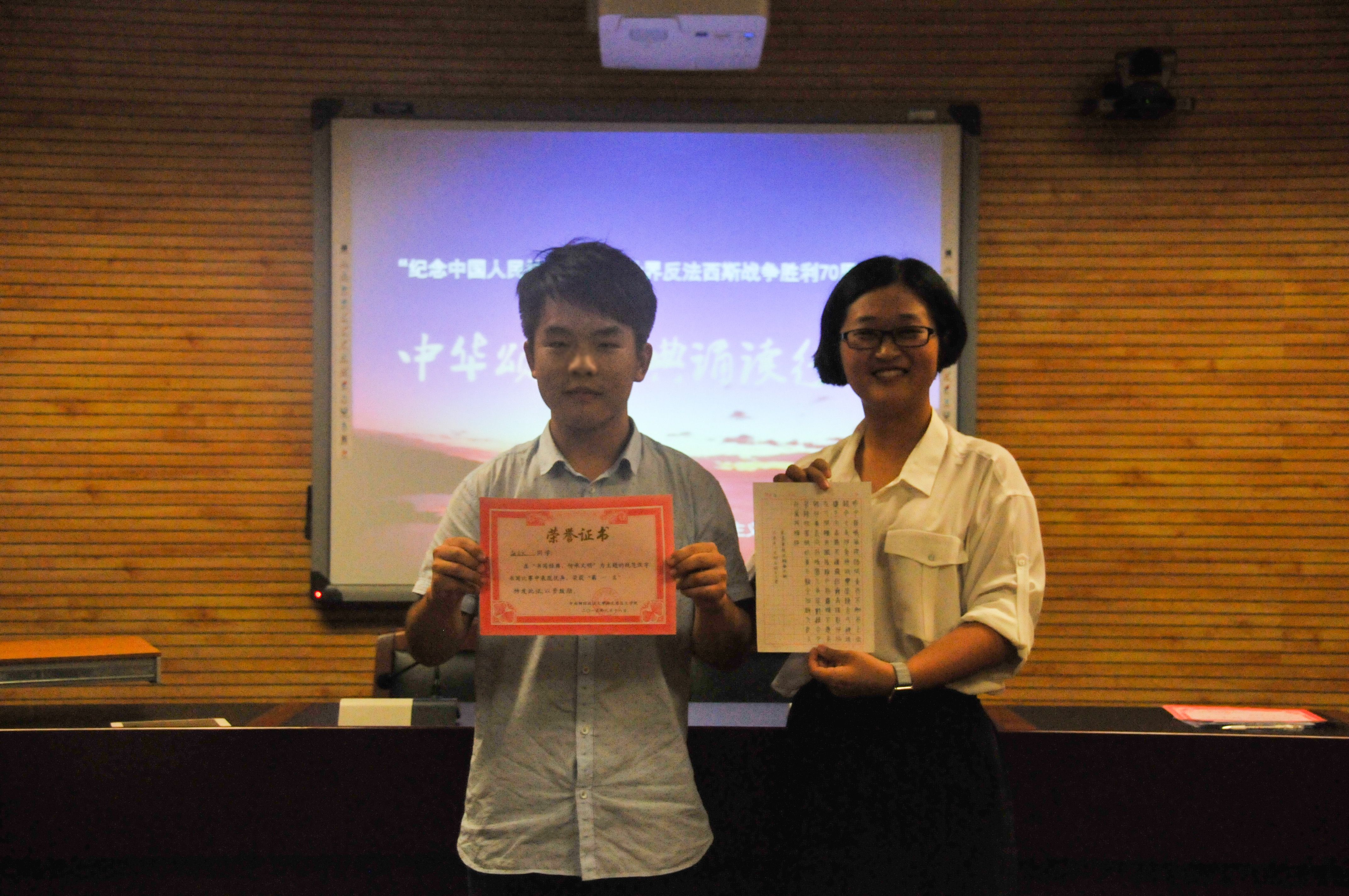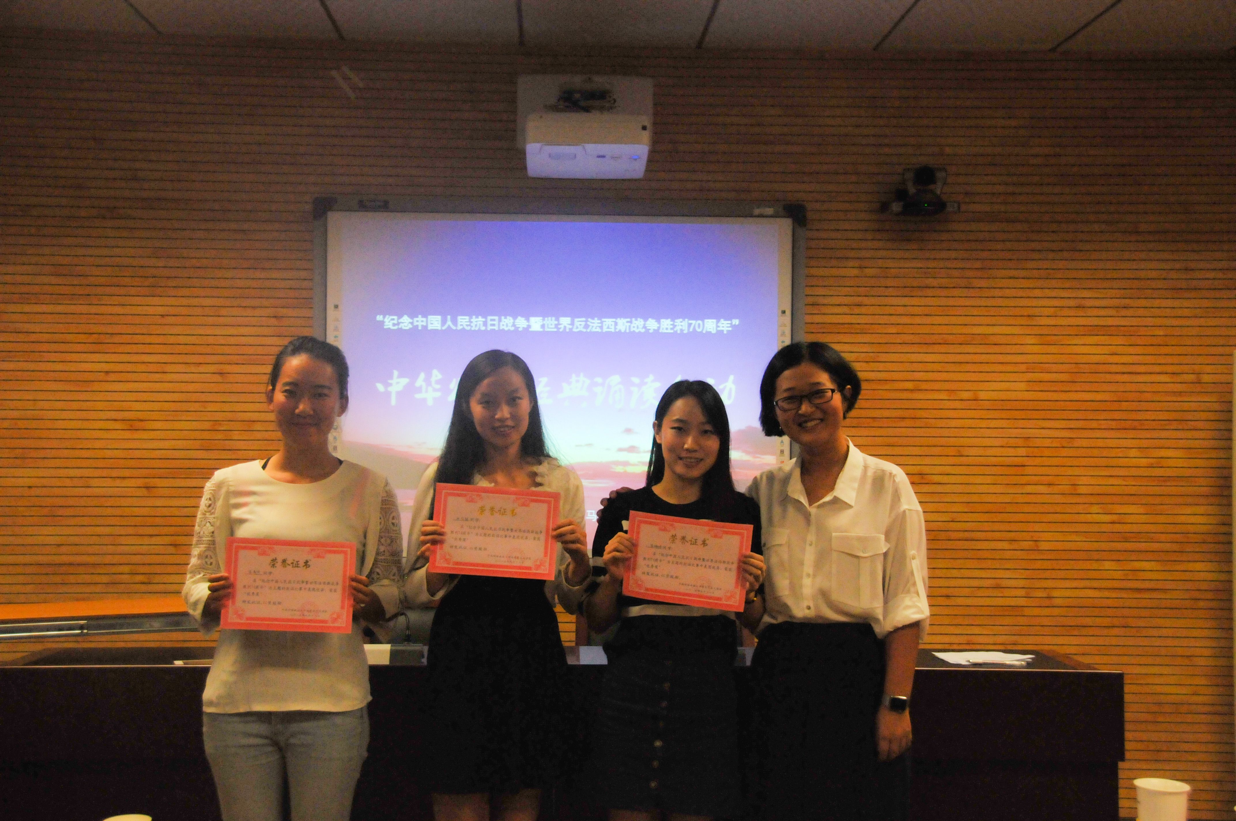 比赛精彩纷呈,以抗战胜利为主题的诗歌,散文,记叙文,议论文等形式的朗诵均在比赛中有所呈现,比赛也掀起了一层又一层热浪,一波又一波高潮。经过两个多小时的激烈比拼,最终胡立文以一首《相信未来》一举夺得本次比赛一等奖。王璐获得二等奖。陆艳和杨莉楠荣获三等奖。苏婉妹、宋春玲、孙佳越获得优秀奖。比赛在高老师的详细点评中圆满结束。