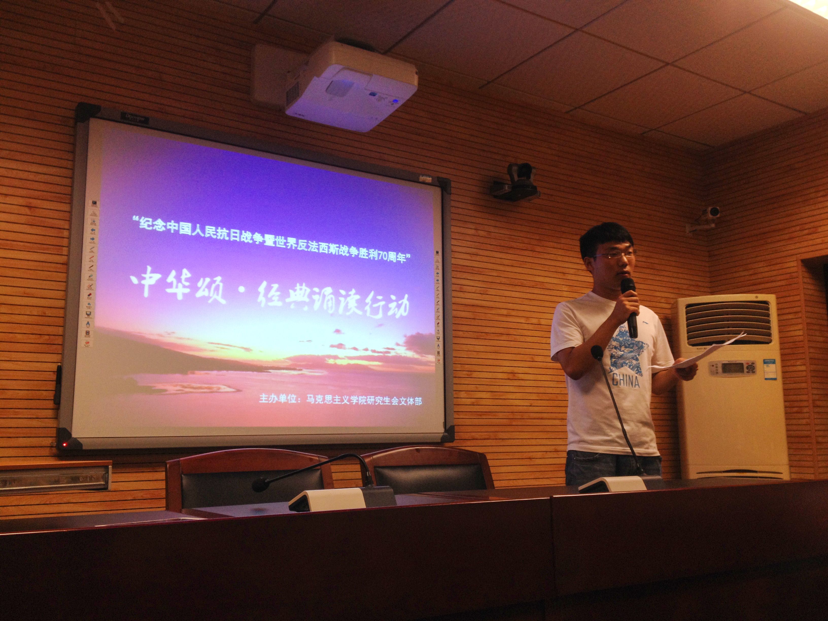 (通讯员:孙佳越 摄影:苏婉妹)为了积极响应学校开展的“中华诵·经典诵读行动”活动,加强对全体师生的爱国主义教育,马克思主义学院于9月18日晚在文沛楼409会议室举办以“纪念中国人民抗日战争暨世界反法西斯战争胜利70周年”为主题的大型诵读比赛。