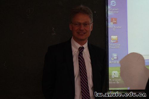 Schwabach教授从美国法律专业大学生的入学方式说起,讲述美国法律专业的学生如何到美做律师的几种方法,介绍美国律师行业的一些现状。随后他从选拔条件、学制学时、学习费用以及项目特色等方面对托马斯杰弗逊法学院JD项目进行介绍,并指出该项目主要针对本科为法学而又希望出国留学的同学。谈及该校JD项目的特色时,Schwabach将其与一般的法律博士项目对比,并做详细阐述:该项目不仅免除了LSAT考试、学时可以减少一年而且还有相当可观的奖学金。另外,与毕业后只可以参加两个州律师资格考试的LLM项目对比, JD毕业后可以参加美国50个州的律师资格考试。Schwabach教授还对该项目在两年内所需要学习的全部课程按照学期的先后顺序进行简单说明,并讲到:“学习期间,学生会得到托马斯杰弗逊法学院提供的优质法律系统实习机会以及选择经托马斯杰弗逊法学院特别学术研究中心认证的项目的机会。”