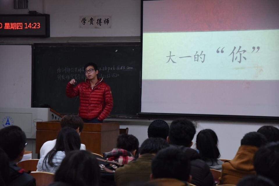 12月10日下午,第九期团校培训班开班暨第一次理论授课分别在南湖校区和首义校区举行,湖北省“青马班”两期四位学员李子昂、朱沁妤、汪宇瑾、师文坛结合培训班学习体会和基层锻炼经历作主题分享授课,本期团校200余名学员参加了培训学习。