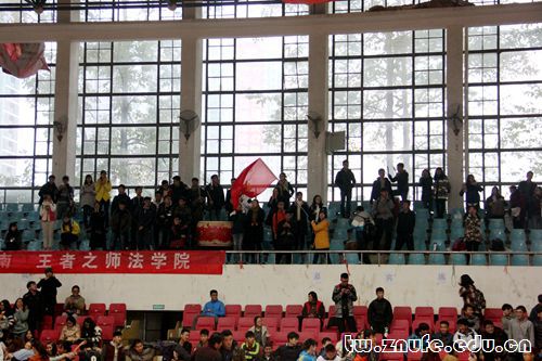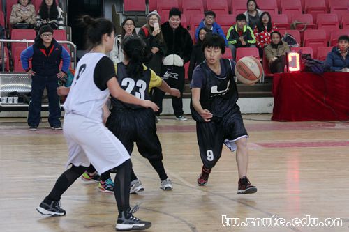 中场休息后,双方易地再战。我院女篮队员依旧采取严密防守战略,由9号球员胡晗控制我院进攻节奏。不甚明朗的形势延续到第四节,比分一度拉至31:37。胡晗迅速运球,左突右击,冲出重围,切入篮下,投出关键一球,振奋全队士气,比分在最后两分钟时追至39:39。持平的局面下,赛事进入白热化程度,双方球员们快速回防、进攻,展开更加激烈的厮杀。赶超,再度持平,再次出现差距——迂回的赛事扣人心弦,吸引全场注目。对方在时间仅剩40秒时犯规,胡晗得到两个罚球机会,此时比分为42:43,我院以一分落后。胡晗顶住压力,一投,球空心入框;二投,再次命中!法学院观众席中响起震天鼓声与欢呼声。关键两分的斩获,使我院成功将冠军纳入囊中。