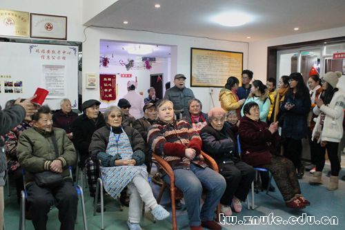 志愿者们为老人们准备了丰富的节目和精美的小礼品。文艺表演在一首《强军战歌》中拉开了帷幕。悠扬的歌声似乎带我们回到了那个革命的年代。受到合唱的鼓舞,不少老人也唱出了自己喜欢的“老歌”——《红星闪闪》、《没有共产党就没有新中国》。经典歌曲被老人们不再清脆却饱含岁月沉淀的声音唱出,迅速活跃了现场的气氛,大家不约而同地为老人们打着节拍。