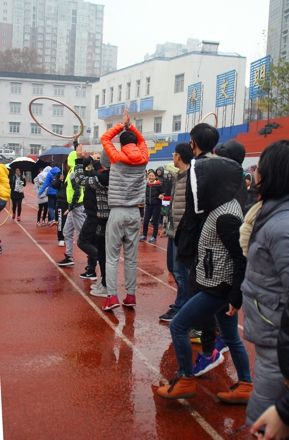 首先开始的项目是“时代列车”,每个班级派十名代表参赛,这是最考验团队协作的一个项目,要求团队中的所有人步伐一致,一同向前跑,运动员们喊着整齐响亮的口号,观众们也为他们欢呼呐喊,每一个班级的代表队都竭尽全力以最快的速度完成了比赛。接下来的项目是“穿越”,由每个班级各派十六名代表参赛,同学们手拉着手,互相协助让呼啦圈从排头传至排尾,比赛过程中笑声不断,每个人都紧张而又兴奋,场面热闹非凡。第三个项目是最激烈的“踩气球大战”,各班派出十名代表参赛,同学们冒着雨在运动场上追逐、欢笑,气球炸裂的声音此起彼伏,场上的运动员情绪高昂,场下的观众们也被赛事牵动着,丝毫感受不到天气的寒冷,经过了十分钟的激烈角逐,这项比赛也落下了帷幕。