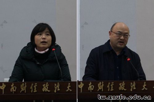 麻昌华副院长就自己分管的工作进行述职,从工作表现、辅修双学位管理、校友会工作、学院社会服务培训工作四个方面进行介绍,并表示在新的一年里,会加强与校友之间的联系,及时调整工作方式,适应新常态。黎江虹副院长将自己去年的工作总结为挑战、适应、积极创新。她从研究生工作、师资引进、图书馆建设等方面介绍自己的工作,在强化研究生创新能力、提高硕博研究生质量、开拓校内外实践基地方面成绩斐然。简基松副院长就法学院国际班建设、国际留学教育发展、聘请外籍教师开课、开设全英文授课课程等内容作了具体阐述,细数法学院在国际交流方面在2015年所取得的进步。张红副院长介绍了法学院在学术、科研方面取得的成果。在去年一年里,法学院各种学术活动交流频繁,科研重大立项成果丰富,学术论文发表数量众多,成果颇丰。胡弘弘副院长就教学管理、课程建设、校外法学教育实践工作、法学院创新试验课程等工作成果进行了介绍,并对2016年进行了展望,希望能够在申报网络视频公开课、网络评教机制、人才培养方案完善方面取得进一步发展。袁桂君副书记就自我理论学习、学生工作、思想引导、文体活动、新生教育、工会活动等工作进行了汇报。