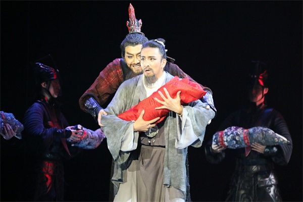 演员们精湛的表演获得场下观众的阵阵掌声,时而壮阔而节奏铿锵,时而悠扬清丽的音乐将观众逐步带入舞台世界。最扣人心弦的是在全剧的高潮“复仇”一幕中,程婴与赵孤行刺未成,程婴以身为赵孤挡剑,尽最后一口气痛斥屠案贾的暴行。赵孤的勇气蓬勃而发,倾尽其力,为这长达十六年的仇恨画下沉重的句号。场景引人入胜,恢弘而震撼。
