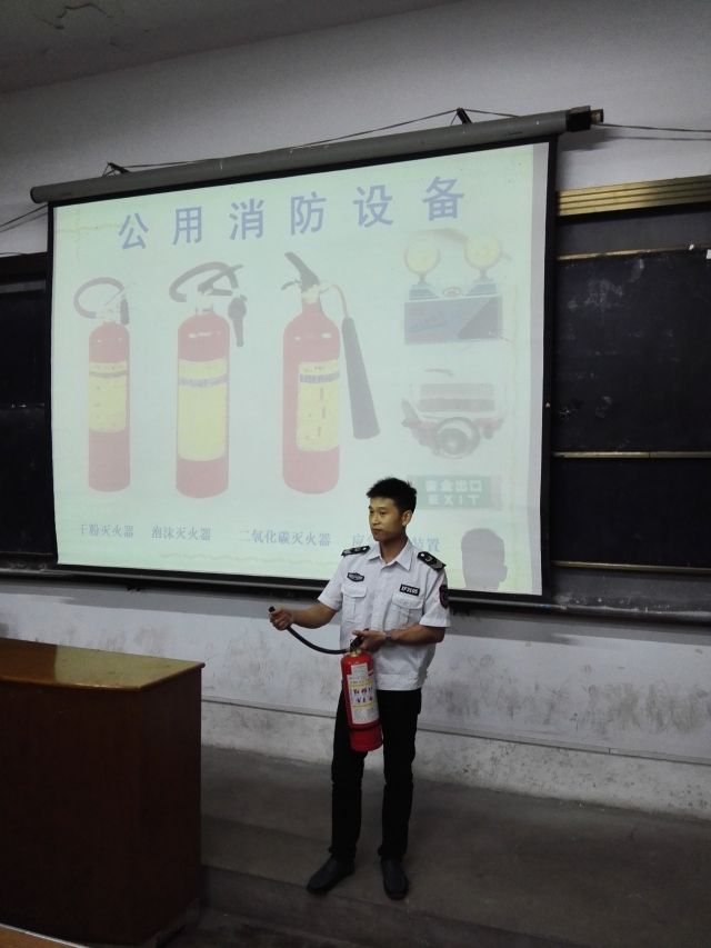 赵俊龙教员在现场演示了防毒面具的使用,现场的同学们十分认真的观看和模仿。介绍完水、沙子、湿被子、灭火器这常用的四大类的灭火工具后,教员又对公用消防设备即灭火器的使用进行了具体教学。他告知大家现阶段消防有三大难题:救灾高度达不到;消防通道不通畅;公众防盗意识太高以至于不便于进行救援,而解决这些问题需要大家的共同努力。最后教员表示遇火灾千万不要慌张,并留下了联系方式供同学们日后联系,询问相关问题。