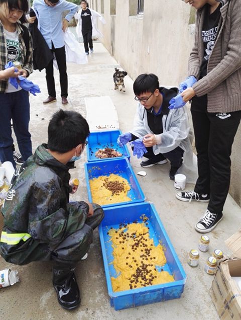 在工作人员的指导下,志愿者们开始为流浪狗修剪毛发。在志愿者们温柔耐心的陪伴下,小狗们原本紧张不安的心情都慢慢平复下来。之后,志愿者们用事先准备好的火腿肠和南瓜酱为流浪宠物们制作午饭。考虑到一些体型较小的宠物狗不能吞下大块的食物,志愿者们便将火腿肠剪成小块,和南瓜酱搅拌在一起喂给流浪狗们吃。短暂的休息后,志愿者们在工作人员的分配下,每人带着一只流浪狗在救助中心的草地上玩耍。志愿者们和它们追逐嬉戏,构成了一幅人与动物和谐共处的美好景象。