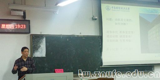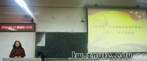 新闻网讯(学生记者 白婕 摄影 陶陈)2016年11月17日晚,我校原党委常委、副校长刘可风教授在文澜110为工商学院分党校培训班讲授党课《怎样做一名合格的学生共产党员》,学院本科生、研究生发展对象、预备党员及党员参加学习。院党委书记王华路、党委副书记吕宗瑛、组织员刘淑君以及学办主任曾洁,辅导员水晶晶、马晴参与听课,王华路担任主持。