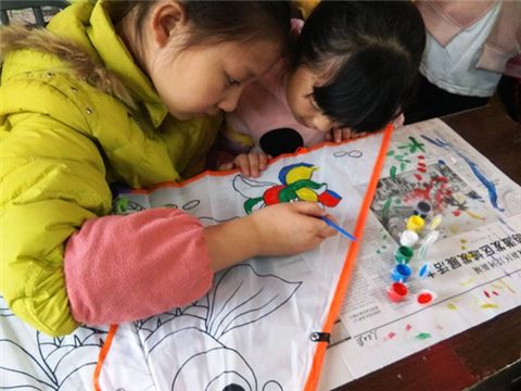 上午8点40分,志愿者们来到了活动中心。在负责人的统一安排下,志愿者们事先把没有染色的风筝和涂料摆在桌上,等待孩子们的到来。大约9点,老师带领着孩子们来到活动现场,他们头戴小红帽,口里唱着“小眼睛,看这里……一二一”,队伍的整齐划一。为了培养孩子们团结协作的能力,志愿者安排每两个人一组,在详细讲解后,孩子们便开始进行自己的创作。在对风筝进行加工染色的过程中,孩子们充分发挥自己的想象进行大胆创作。他们对色彩极为敏感,制作的风筝十分独特令人耳目一新。