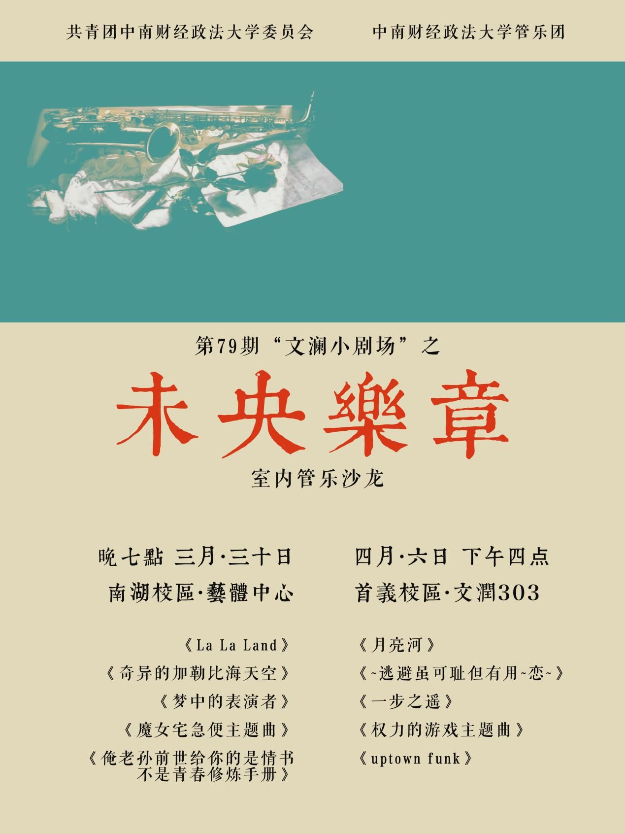 演出地点及时间:南湖校区 艺体中心音乐厅3月30号(周四)晚七点