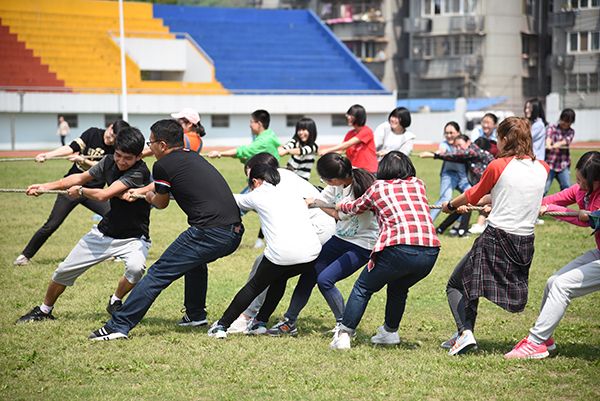 天气炎热,同学们的热情却没有因此受阻,大运场热闹非凡。在新疆韵律健身操场地,大家和着音乐、踏着节拍舞蹈。一旁的“跳竹竿”分外吸睛,同学们跟着敲击的节奏在交叉的竹竿中灵活跳跃,感受黎族的乡土风情。另一旁,随着裁判员一声令下,五十多人开始了藏语中被称为“浪波聂孜”的“四象拔河”,一条长绸布带做成的圆环分别套于参赛男同学的颈部(女同学则套于腰部),选手四肢着地向自己的前进方向奋力爬进。赛后,选手们大汗淋漓,却又表示意犹未尽。而团体项目板鞋竞速和花样毽球同样人气高涨,参赛队员们通力配合,享受到了运动的快乐,也体验了别样的民族风情。