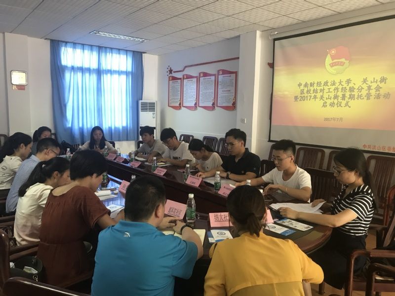 新闻网讯(通讯员 黄覃 张晴)7月5日下午2时许,我校与洪山区关山街区校结对工作经验分享会暨2017年关山街暑期托管活动启动仪式成功举办在洪山区关山街邮科院社区举行,关山街团工委向蓉书记、校团委范献龙副书记、校团委志愿服务工作负责人、青马班学员社区挂职锻炼成员代表、区校结对志愿者代表及邮科院社区、碧水社区、纺大社区、南湖社区等关山街下辖8位社区团委负责人参加了此次分享会。