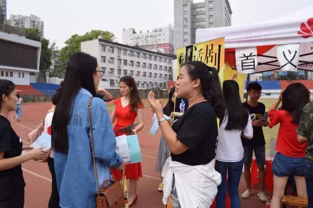首义大运场里,各社团都出摊摆点,展示社团独特风采,吸引了众多新生社员。尽管第一天下起了小雨,大运场仍是人头攒动,而第二天阳光晴朗,现场气氛更是热烈。同学们充怀着激情和好奇穿梭其中,或驻足停留,或欣赏问询。在为期两天的百团大战里,各社团更是做好了充足准备,没有辜负同学们的期待。面对同学们的相关疑问,各个社团热情耐心地为他们介绍与解答。除此之外,社团风采展示更是别具魅力。吉他协会的深情弹唱,引人入胜,不仅为同学们展现了一场视听盛宴,还提供乐器让大家试练;希贤国学社社员身着汉服,端庄大方典雅秀丽,展示了中华民族的传统文化;东西动漫社展板精致,服饰华丽 ,表达了后现代主义的动漫特色;“爱无声”手语协会舞动指尖,向我们传达着最美的声音;风魅轮滑社炫酷的步伐,火热的招呼,一次次点燃全场热情。