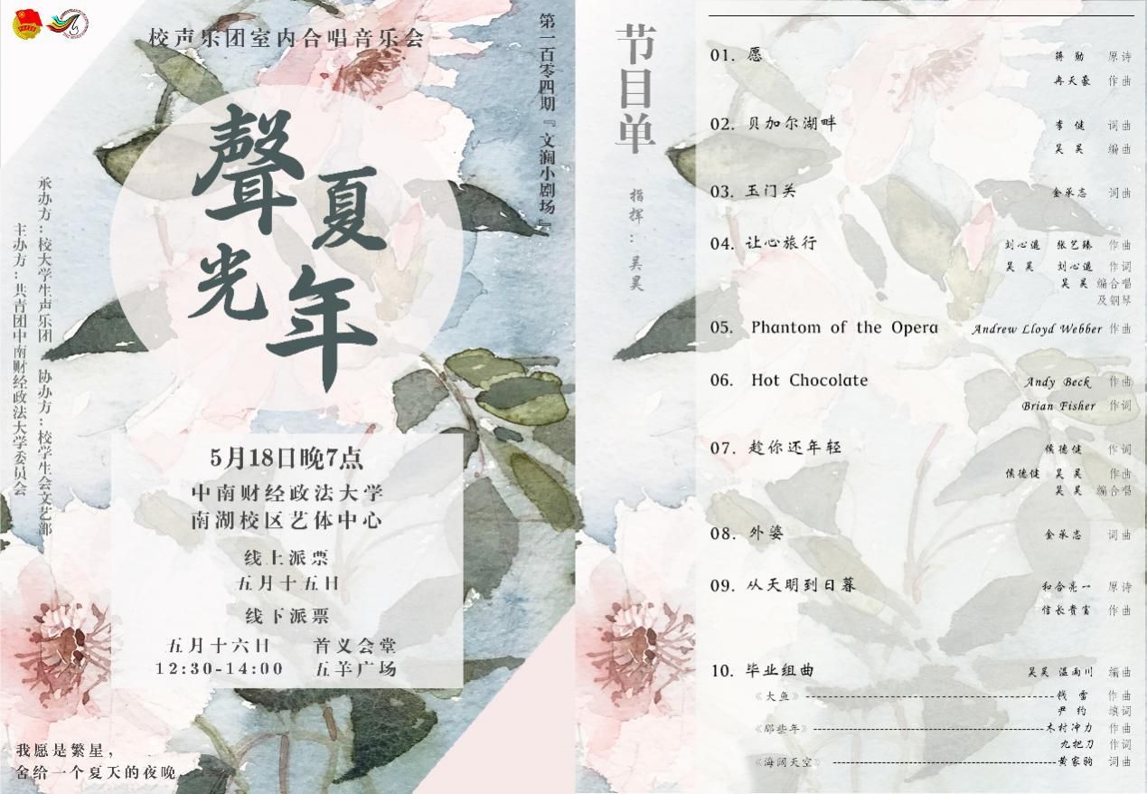米兰电竞·(中国区)大学生声乐团,简称校声乐团,是隶属校团委的唯一校级学生声乐团体,是集合唱、重唱、独唱、阿卡贝拉无伴奏重唱为一体的多元化的声乐团体,由资深专业音乐教师进行指导,代表学校参加各级演出和比赛并取得优异成绩。 “声夏光年”室内专场音乐会是校声乐团的品牌演出之一,在每年夏季举办。2019年的“声夏光年”专场在经典曲目的基础上新增了多首最新排练曲目,风格多样,或感人至深,或气势恢宏,相信将会带给观众一场夏日听觉盛宴。