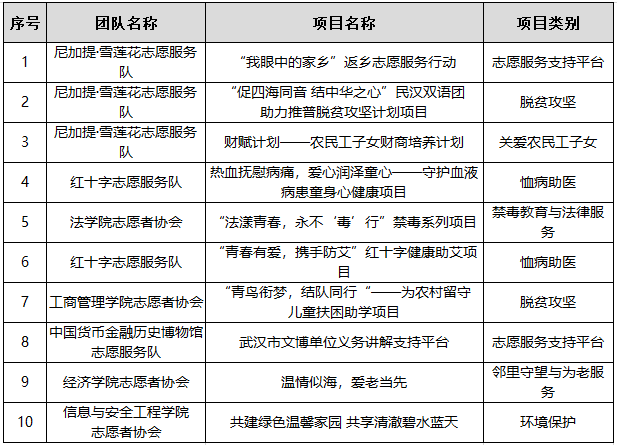 根据《关于开展2019-2020学年共青团工作“五四”综合表彰的通知》及我校志愿服务工作实际,通过材料申报、线上评审等程序,经校团委、校志愿者协会研究决定,拟定“我眼中的家乡”返乡志愿服务行动、“促四海同音 结中华之心”民汉双语团助力推普脱贫攻坚计划项目以及财赋计划——农民工子女财商培养计划等10项志愿服务项目获评“十佳志愿公益项目”荣誉称号。现将项目名单公示如下: