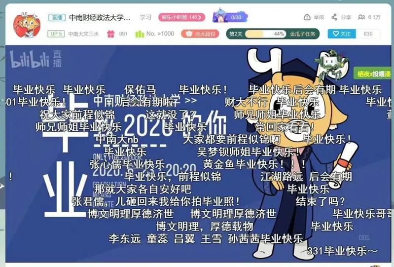 线上送毕晚会于6月23日晚20点20分在哔哩哔哩网站、微博、微信公众号同步直播。晚会内容丰富、形式多样,视频采用录播与后期制作结合的形式,为2020届毕业生们送上毕业的祝福。本次线上晚会直播,哔哩哔哩直播平台,观看人数达6.2万人次,弹幕互动数量近万条,微博平台观看4.1万次,线上直播观看看10万+。毕业生们在纷纷留言,表达了对学校的热爱、毕业的不舍,在校生们也送上了对毕业生的祝福。