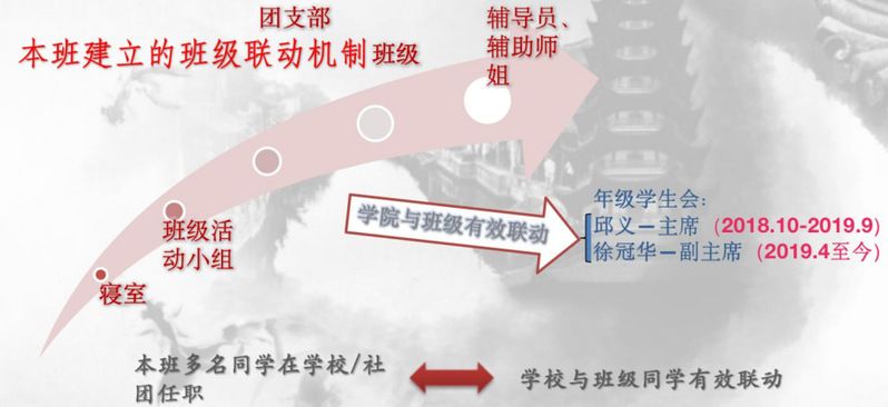 团支部同学积极参与校院两级的学生组织,例如:邱义同学任工商18级年级学生会主席,徐冠华同学任工商18级年级学生会副主席。在校院两级学生组织任职的本班同学精准把握支部成员的思想动态和成长需求,引导支部成员积极围绕学校、学院和支部的中心工作,在学校“双一流”学科建设、全面深化综合改革中积极进言献策。据不完全统计,担任校院两级学生代表的本支部同学提案共计20余件。