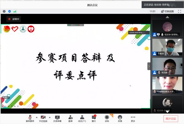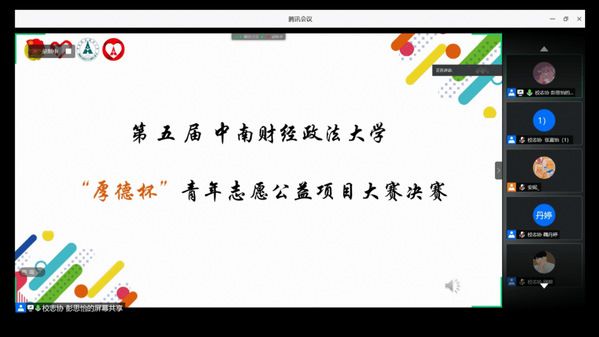 新闻网讯(学生记者 彭思思)8月14日上午8:30,第五届“厚德杯”青年志愿公益项目大赛决赛在腾讯会议平台顺利举行。湖北省志愿者中心部长贺茂林老师、校团委书记梁娜老师、党委宣传部副部长徐江老师、学生工作部副部长范献龙老师、校团委副书记夏东伟老师、工商管理学院尼加提·艾买提老师担任此次大赛的评委。参加本次答辩会的还有校团委潘芳老师。