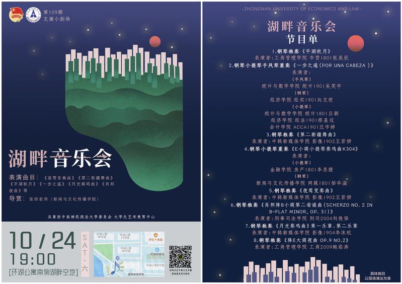 碧水澄净,音韵婉长,对音乐怀揣着热爱的中南大学子,在月明星稀的秋夜下,以湖泊为背景,以大地为舞台,在黑白琴键上为大家带来身临其境的艺术体验。