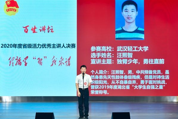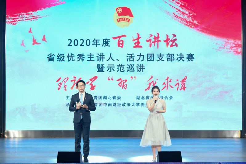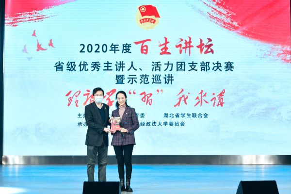 (通讯员:胡瑢 学生记者:李夏欣 张家耀 摄影:李夏欣 袁迪 李光正)12月9日上午,由共青团湖北省委员会、湖北省学生联合会主办的2020年度“百生讲坛”省级优秀主讲人、活力团支部决赛暨示范巡讲活动在我校南湖校区南湖会堂举行。根据新冠肺炎疫情常态化防控要求,本次活动通过线下宣讲与线上直播相结合的形式进行。共青团湖北省委副书记张澍、校党委常委、副校长刘仁山与来自17所高校的400余名师生代表现场观摩了比赛,全省14万团员青年通过直播平台观看了大赛直播。