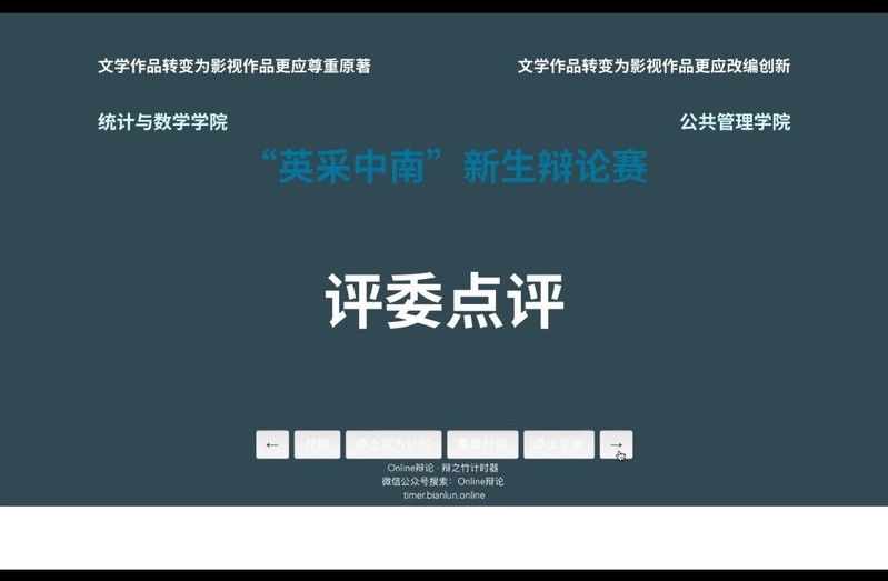 本次辩论赛,各队辩手围绕“阅读文学作品应抱持‘作者已死’还是‘作者未死’的态度”和“文学作品转变为影视作品更应尊重原著还是改编创新”两个话题展开了精彩的攻防。辩论场上,立论清晰有力,论证有理有据,对辩思维灵活,诸如“文学作品解读多元化”、“保护原著艺术性”、“规避文学作品商业化弊端”等深刻之思考、简洁之阐述层出不穷,将赛事推向一波又一波的高潮。你攻我防,思维碰撞,尽显菁英风采!