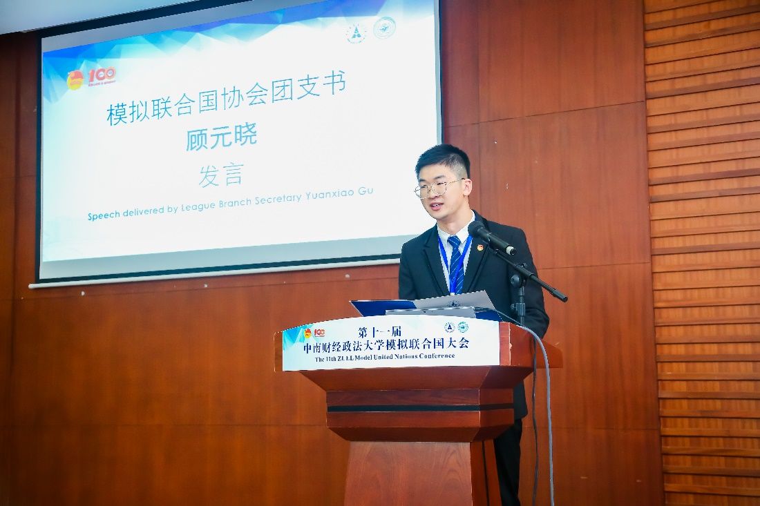 接着,协会团支部书记顾元晓从活动的切身参与者角度出发,分享了他对模联活动的看法。他以去年的校内会为例,指出模拟联合国活动为参与者提供了表达自己从不同国家立场、不同角度思考全人类共同面对的国际议题的见解的平台,培养参与者的世界公民意识。同时,他鼓励大家成为多学科融通、具有国际视野和跨文化沟通交流能力的德才兼备的国际人才。
