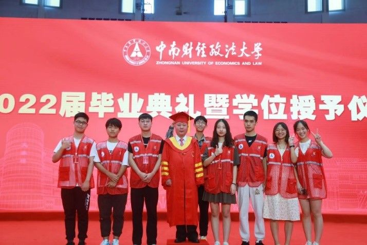 在仪式进行的过程中,每一位志愿者各司其职分别负责着引导、消毒与秩序维护等任务,在授予仪式十分密集的时候他们没有任何的休息时间,在加班时也主动留在现场,坚持今日活动结束后再离开。他们是优秀的中国共产党党员、他们是即将在中南大开启新生活的老同学、而他们也更是沐浴着艺体中心耀眼灯光的青年毕业生,他们在此次学位授予仪式中的努力看在每一位老师的眼里,看在每一位同学的眼里,更看在校长的眼里,在学位授予仪式结束后,校长与这些志愿者共同合影留恋,向他们表达了来自中南大的勉励与祝福。