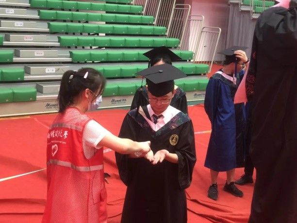在此次学位授予仪式中,在校长的身边有几位与众不同的志愿者引起了人们的关注,他们身着本科学士学位服,本该在今日享受毕业时光,接受校长拨穗的他们,却站在了校长身前与身后,承担着为校长递卷轴与引导学生的特殊的志愿服务任务。据校团委老师回忆,以往的这项任务都是由非毕业年级志愿者协助完成,今年是首次以应届毕业生为主体,参与到学位授予仪式的志愿活动中。