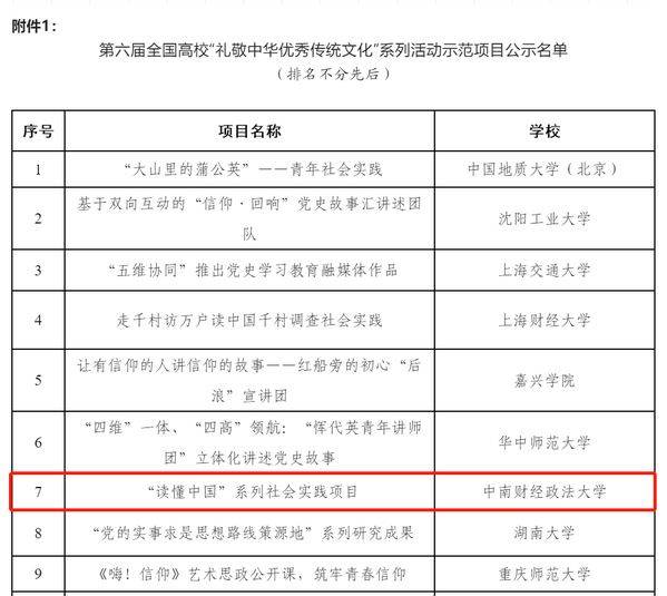 (通讯员 胡瑢 学生记者 吴江波)近日,教育部思想政治工作司公示第六届全国高校“礼敬中华优秀传统文化”系列活动遴选结果,经高校自主申报、专家审核推荐等环节,共推选出示范项目10项、特色展示项目30项。我校“读懂中国”系列社会实践项目成功入选“示范项目”。