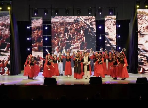 法学院的《阿瓦尔古丽+吉尔拉》,两首高亢悦耳的新疆民族歌曲相得益彰,伴着欢快活泼的维吾尔族舞蹈,演绎出新疆人民在党的二十大提出的团结带领全国各族人民在新时代、新征程坚持和发展中国特色社会主义下的美好生活。