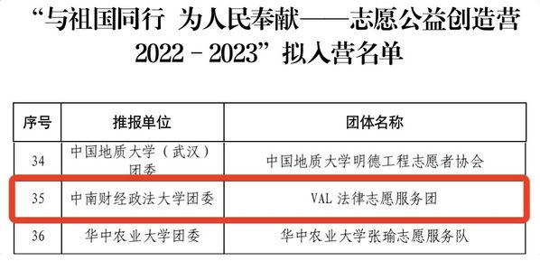 新闻网讯(学生记者 邓乔茵)近日,“与祖国同行 为人民奉献——志愿公益创造营2022-2023”活动入营名单正式公布,我校VAL法律志愿服务团顺利入选。