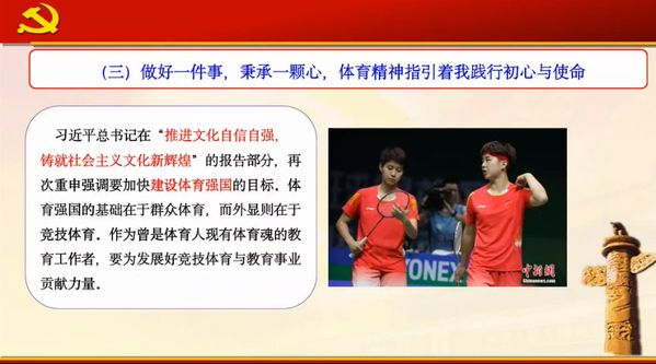 我校体育部副教授李茵晖以“弘扬体育精神,当坚韧的筑梦青年”为题进行分享。李茵晖教授结合自身在体育赛场上的经历,讲述了运动员踔厉奋发、自强不息的动人故事,展现了中国体育人顽强不屈、坚韧不拔的过人意志与拼搏进取、为国争光的崇高信念,深度阐释了中华体育敢于拼搏、不畏困难的精神。李茵晖强调,在二十大报告中,体育、健康等关键词多次被提及,体育强则中国强,国运兴则体育兴,呼吁同学们牢记习近平总书记的嘱托,做有理想、敢担当、能吃苦、肯奋斗的新时代好青年。