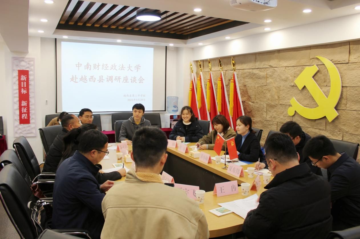 新闻网讯(通讯员 胡瑢 学生通讯员 林雨源)3月28日上午,校团委书记黄小妹、校团委副书记夏东伟、校团委组织部长胡瑢、法学院团委书记钟开炜、金融学院团委书记胡源一行赴四川省凉山彝族自治州越西县看望慰问中南大第24届研究生支教团凉山分队志愿者,并在越西县第二中学举行师生座谈会。越西县团县委书记毛倩,越西县教体科局副局长刘正国、越西县团县委副书记王冉,越西二中党支部书记、校长杨加子,副校长罗立伟、唐凤舞等出席座谈会。调研座谈会由毛倩主持。