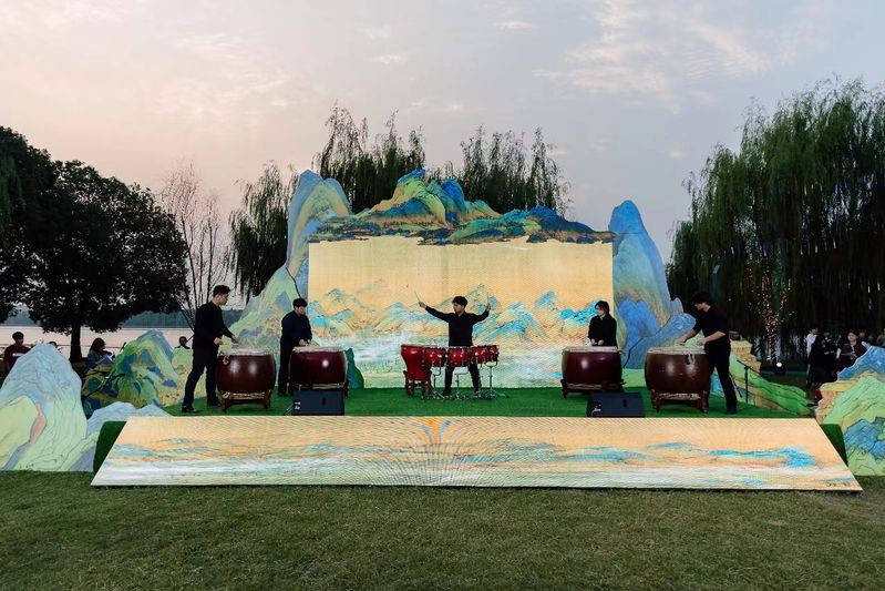 恢弘的旋律在湖光秋色中响起,澎湃的鼓点碰撞出磅礴的狂想,响彻铿金鸣玉之音,中国经典打击乐《龙腾虎跃》拉开了本次音乐会的帷幕。沐浴在夕阳余晖之中,主题旋律与鼓声交相奏鸣,彰显龙腾虎跃之豪迈激昂,谱写中南大学子迎难奋进建新功的壮阔诗行。